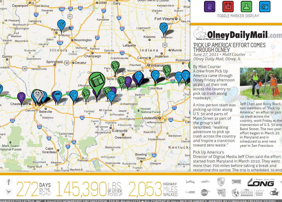 至今為止,網站上顯示Pick Up America這個計畫,一共走過了2,053英哩,撿起了145,390磅的垃圾。結合了科技之後,他們的行動更加具象化,不但可以了解他們穿越的路線,還可以看到每個地點做了什麼事情,怎麼與在地的夥伴做結合...