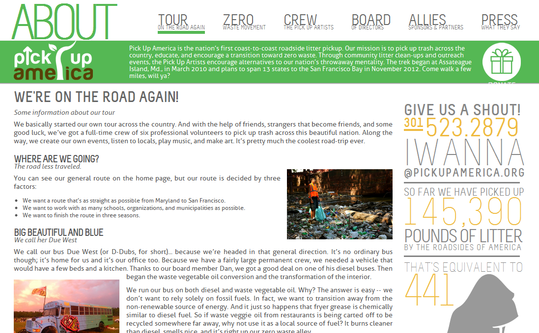 這個網路行動的好案例當然沒這麼簡單。2009由台灣人陳弈正發起的NPO,暑假休息的任務就是橫越全美來撿垃圾,從美國的東岸馬里蘭州,橫跨到西岸的舊金山,在過程中與教育機構、其他NPO志工,一起合作撿起腳下的垃圾,是不是富有教育意義呢?
