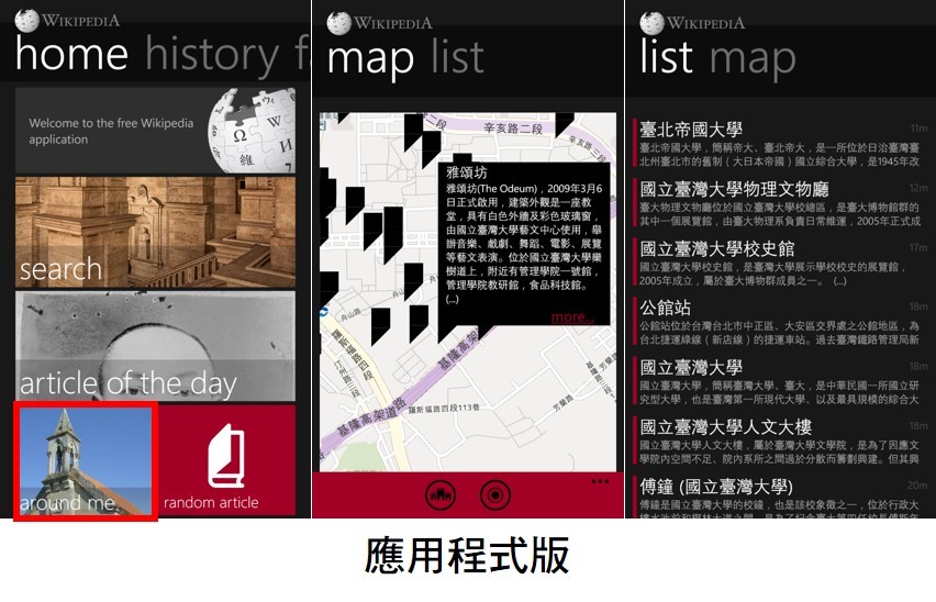 由第三方開發的Wikipedia App也包含此項服務!而且介面更豐富!點選around me就會將自己周遭的景點顯示在地圖上或是以清單呈現。