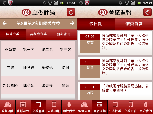 App中包含下列幾個資訊:立法院最新消息、立委評鑑資訊、立委通訊資料等等。最新消息會隨時從立院網站釋出的資訊抓取最新的內容,如果你比較想了解某些特定的委員會的資訊,例如國防委員會、經濟委員會等,也有按照委員會相關區分。較為實用的功能是有每個立委的評鑑、通訊資料,如果你想特別了解某個立委的話,上面有該名立委的臉書、個人網頁、辦公室電話等許多通訊方式,讓你隨時可以找到管道關切選區的立委!!