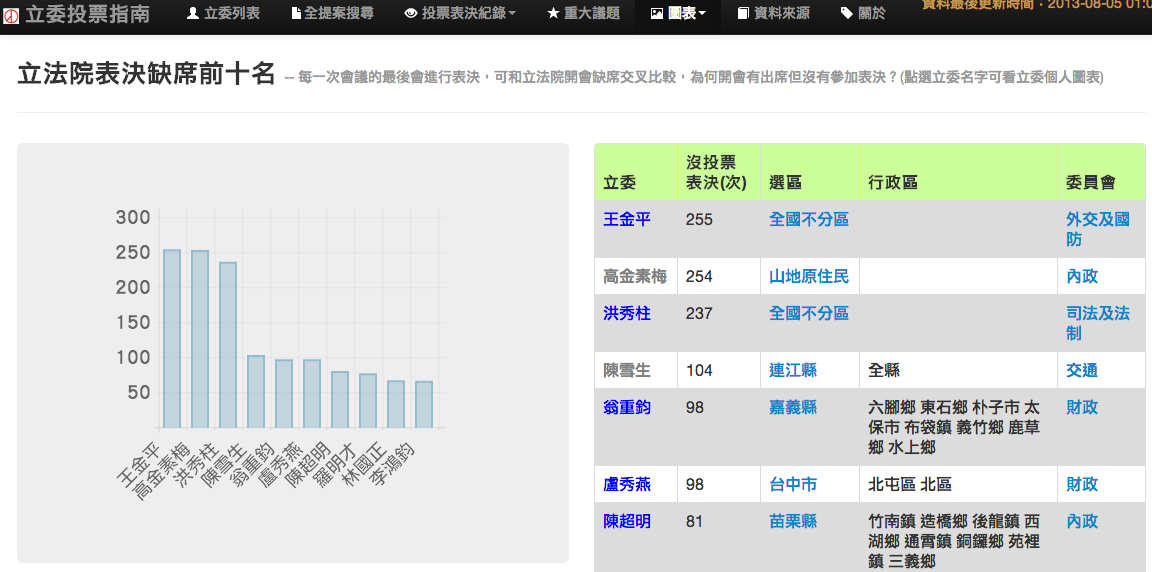 其實除了這款app以外,網路上也有不少人試著把立法院的資料,包括表決結果、出席率...等等,用比較清楚的方式呈現了,像秉持著寫程式改造社會的g0v.tw零時政府就有一個「零時政府立法院」的網站,把每次院會的意見數用圖表呈現,另外也有神人建立了台灣立委投票指南網站,將每次投票表決記錄和出席率用圖表表示,結果一目了然,希望有了這些工具,我們的立委做事會比以前更認真!!