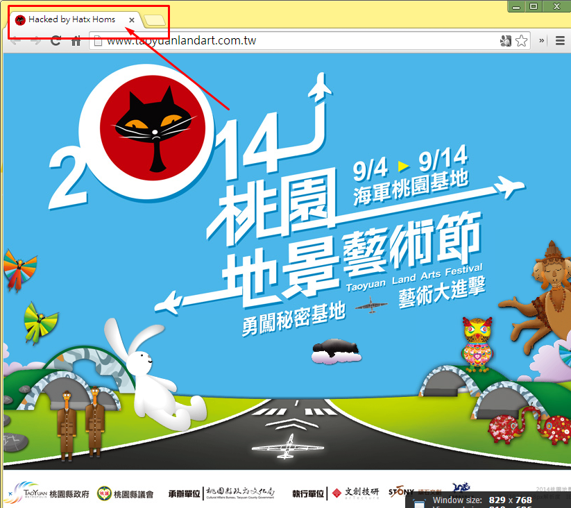 好奇查查,原來號稱帶來21萬工作機會的愛臺12建設,一入國門的建設航空城地景藝術節網頁,居然就被駭掉了!!!九月政府才花了3700萬舉辦的航空城地景藝術節,網頁標題「Hacked by Hatx Homs」刺刺寫在眼前。