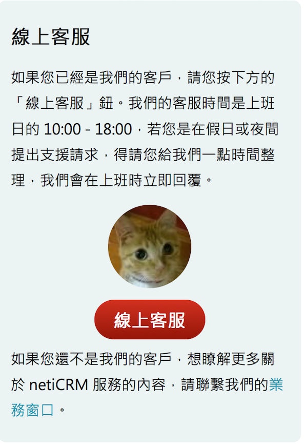 因此,來看看我們的改變吧!首先,在我們 netiCRM(非營利組織管理系統)的客戶服務頁面,放上了我們的總管yana的萌照.