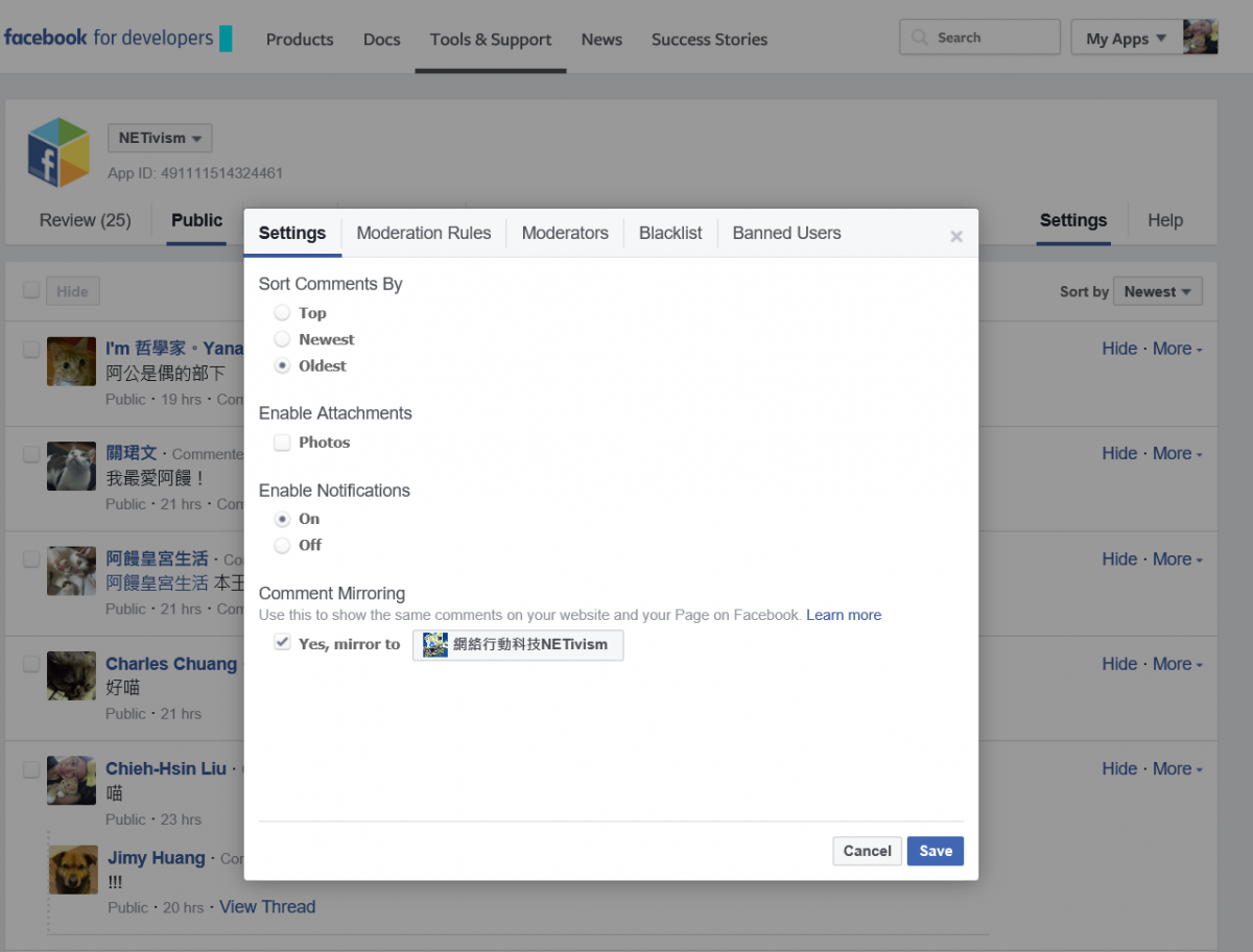 - 在這個留言的Comments Moderation的設定裡,啟用Comment Mirroring,並選擇要mirror過去的粉絲團。(※必須要是粉絲團管理員,才能選擇粉絲團)