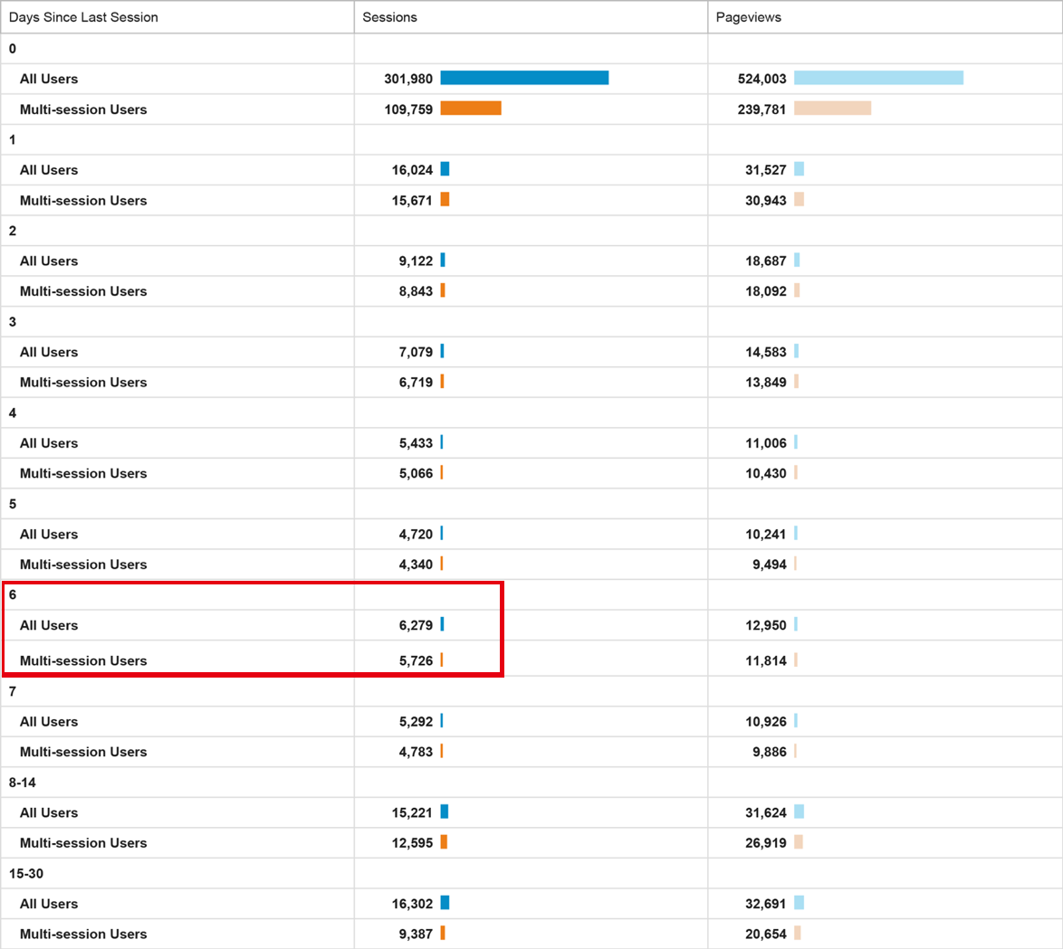 造訪網站的時間間隔可以顯現出經常與非經常使用者之間的不同。當經常性使用者較常發生轉換事件、但造訪頻率較低的人從未轉變的時候,我們可以觀察兩者之間的行為差異。舉例來說,是不是需要採用能吸引更多使用者可以參與的功能或工具?經常性使用者會不會是因為email提醒而來看我們的網站?經常性使用者是不是有設定自動登入?