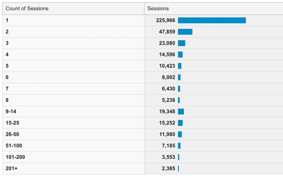 一般而言,網站訪問次數的人數會隨訪問數提升而減少,以上面的圖來看,一個月造訪網站8次的人有5238人;比來1次的人(225966人)還要少,所以只看來訪次數表面的數字沒有太多的意義。次數計算的價值在於「觀察重要活動或事件時網站來訪人次是否有明顯變化」,以推測使用者對活動或事件的興趣。舉例來說,當來訪五至六次的使用者數量發生顯著變化時,網站可以提供提醒這些訪客前次瀏覽紀錄的工具。除此之外,我們也可以利用次數的統計數據發展使用研究。例如:來訪多次的原因是不是因為他們使用網站時遇到障礙?使用者需要比較多個不同的網站內容才能做決定?