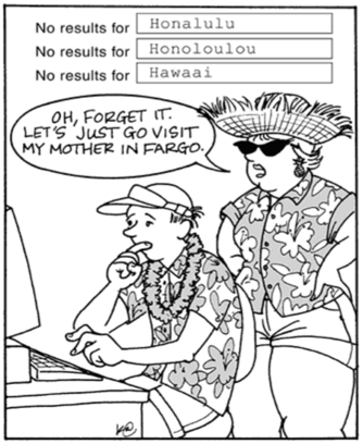 「搜尋」功能是使用者在網站中找不到想要的內容時的一線生機,然而當網站的搜尋功能太過執著於輸入的檢索詞彙,會降低網站的可用性。這種情況在英文網站中有更明顯的差異。由於英文字彙組成的形式較中文複雜,當系統在英文環境中完全依據使用者輸入的字詞而無法偵測或校正拼字錯誤、單複數或該字詞的其他形式,會導致使用者至找不到想要的內容。以下圖為例,使用者想在網站中搜尋夏威夷(Hawaii)、檀香山(Honolulu),但是輸入錯誤成Honalulu、Honoloulou、Hawaai時,如果該搜尋系統無法自動偵錯,使用者就不會找到任何結果。