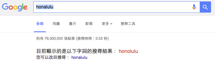 以拼錯字的Honalulu檢索時,系統會自動提示是否查詢為正確的honolulu,提升檢索者找到目標的可能性
