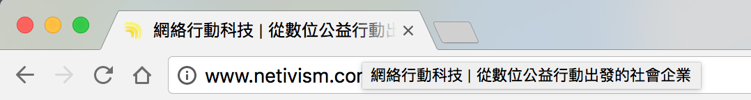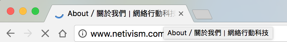 介紹團隊的網頁標題是在組織名稱(網絡行動科技)之前加上頁面主題「關於我們」,因此為「About / 關於我們|網絡行動科技」