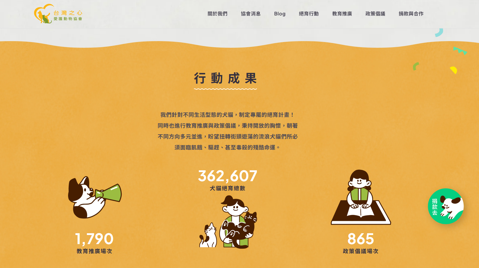 • 「我們的影響力」:組織對整體環境、公益領域有多少社會影響力,都可以透過具體成果與行動里程碑來呈現,增加訪客的認同感。