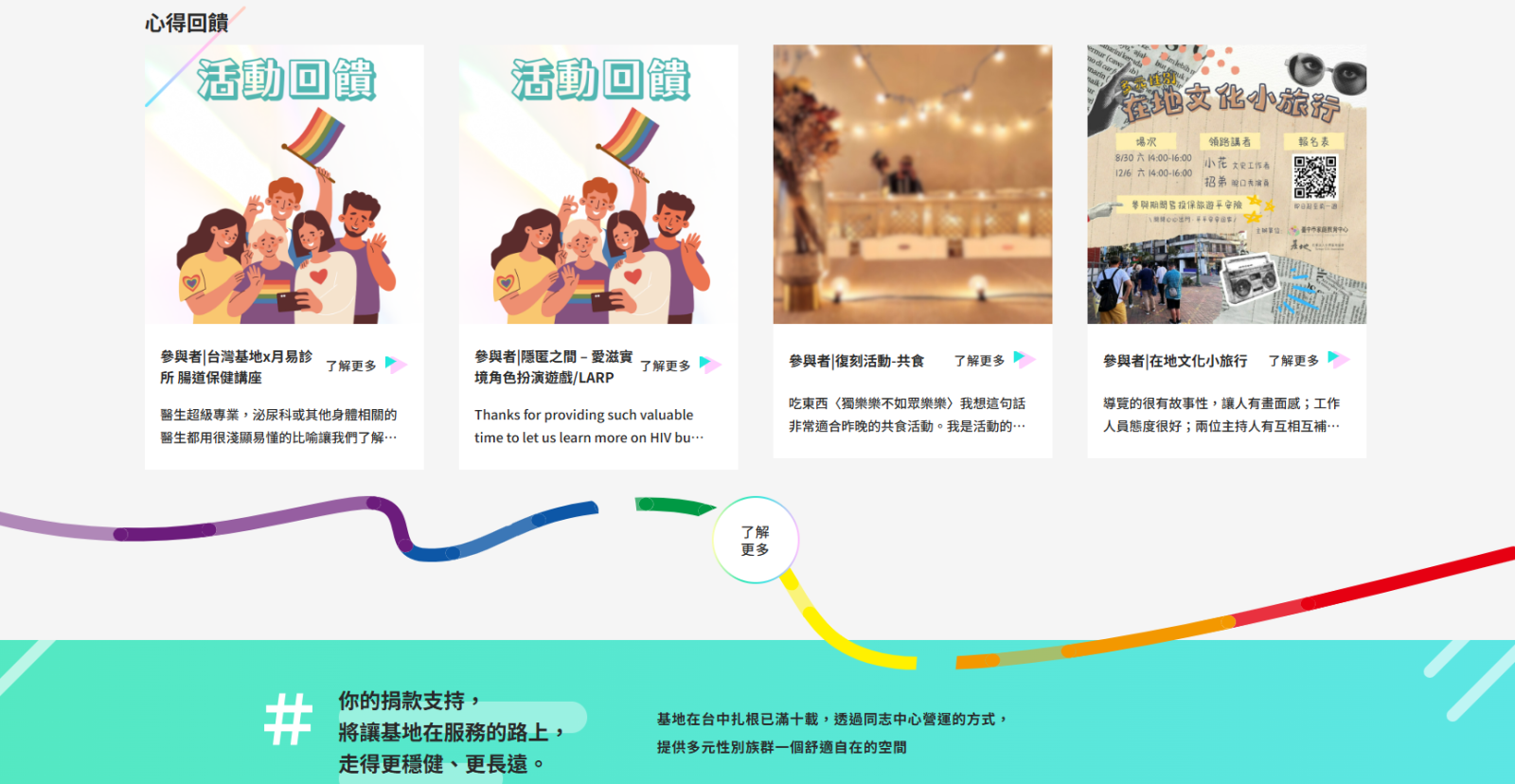圖說:由 NETivism 建置的⌈台灣基地協會⌋ 官網,在首頁呈現豐富的參與者心得回饋,讓服務內容與成果更值得信賴。