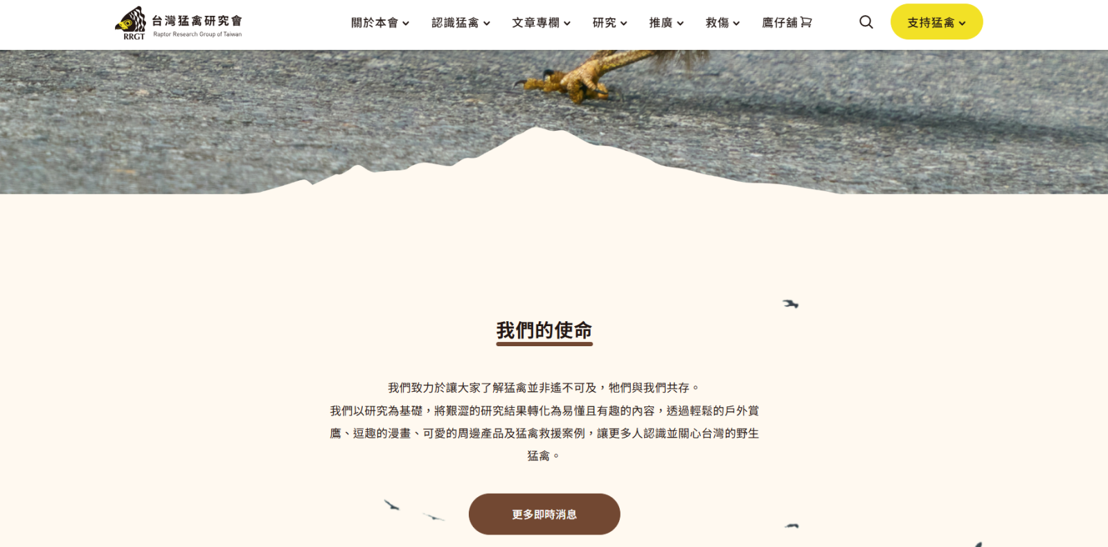 圖說:由 NETivism 協助翻新的⌈台灣猛禽研究會⌋ 官網,即以簡潔有力的使命宣言,讓第一次瀏覽頁面的訪客也能迅速了解組織在做的事