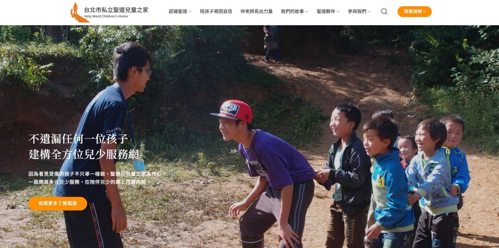 圖說:由 NETivism 建置⌈聖道兒童之家⌋ 官網主視覺區,應用情感訴求強烈的照片搭配黃金敘事呈現組織亟欲改變的服務項目。