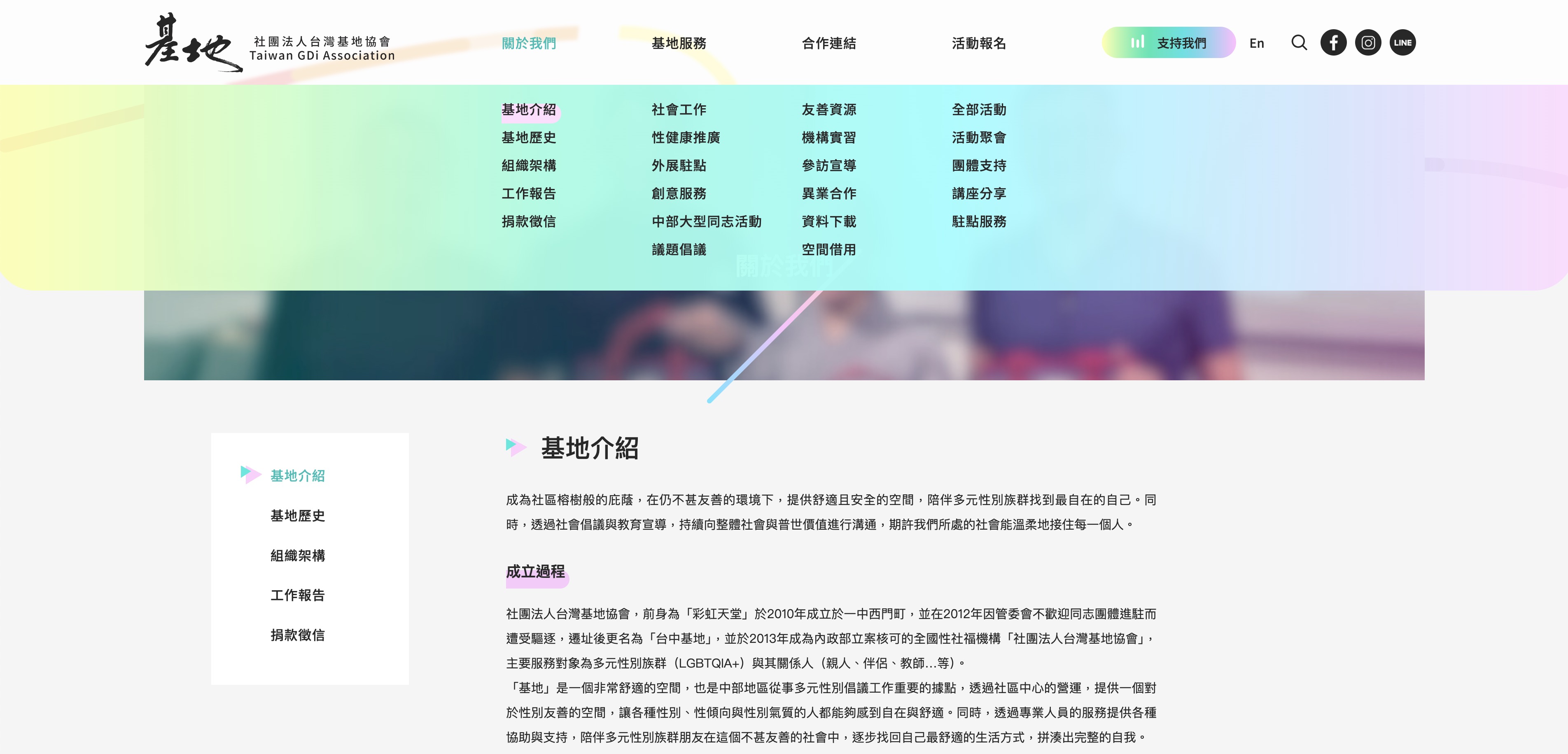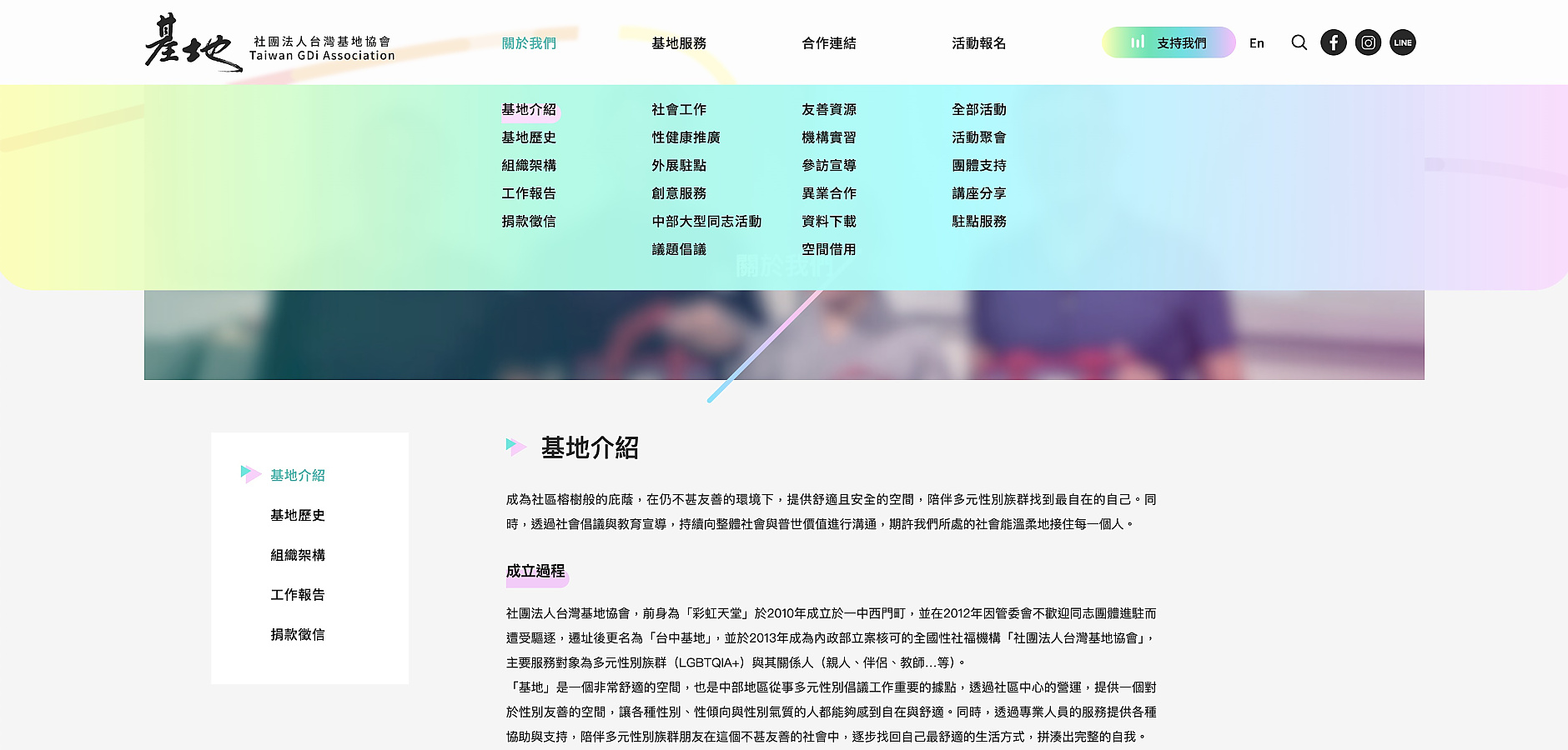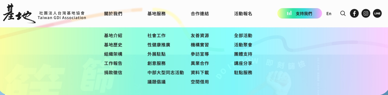 為了讓不同需求的使用者都能快速抵達目的地,在網站建置初期,基地夥伴就將各項業務整合成「基地服務」、「合作連結」、「活動報名」幾大單元,並決定從主選單一次呈現完整的網站架構,瀏覽路徑更直覺。