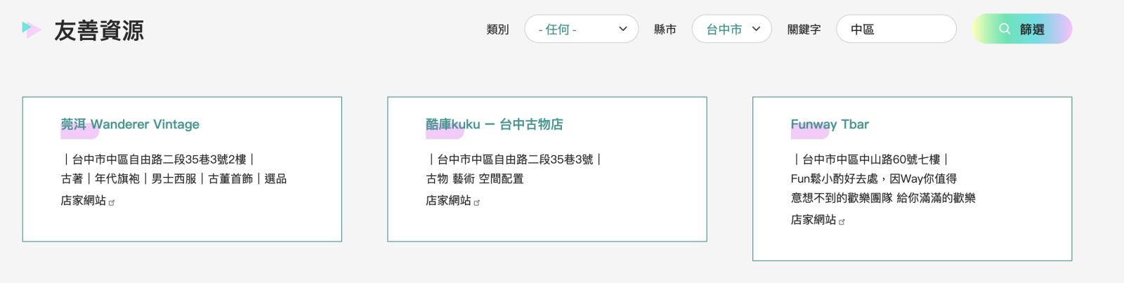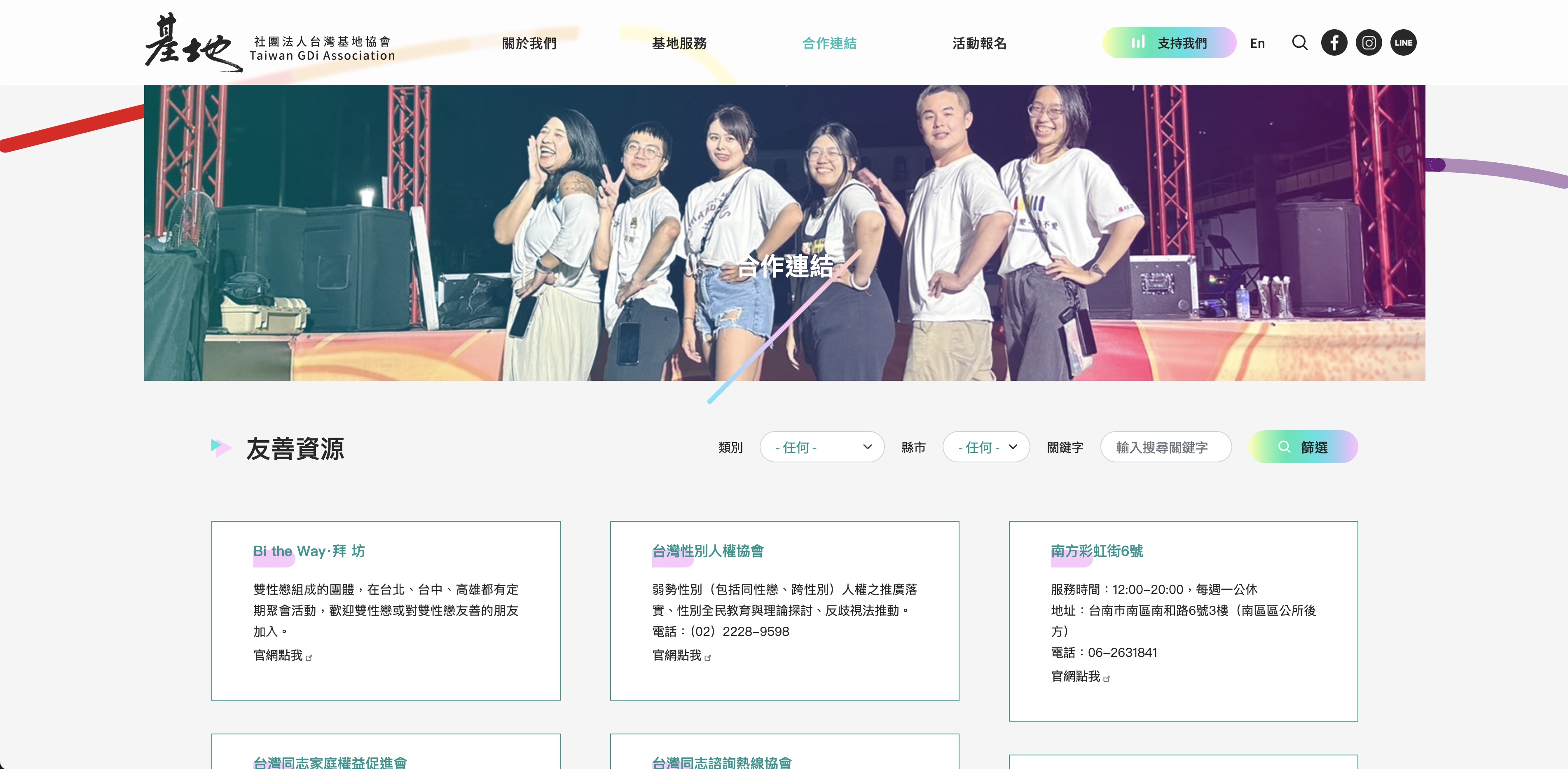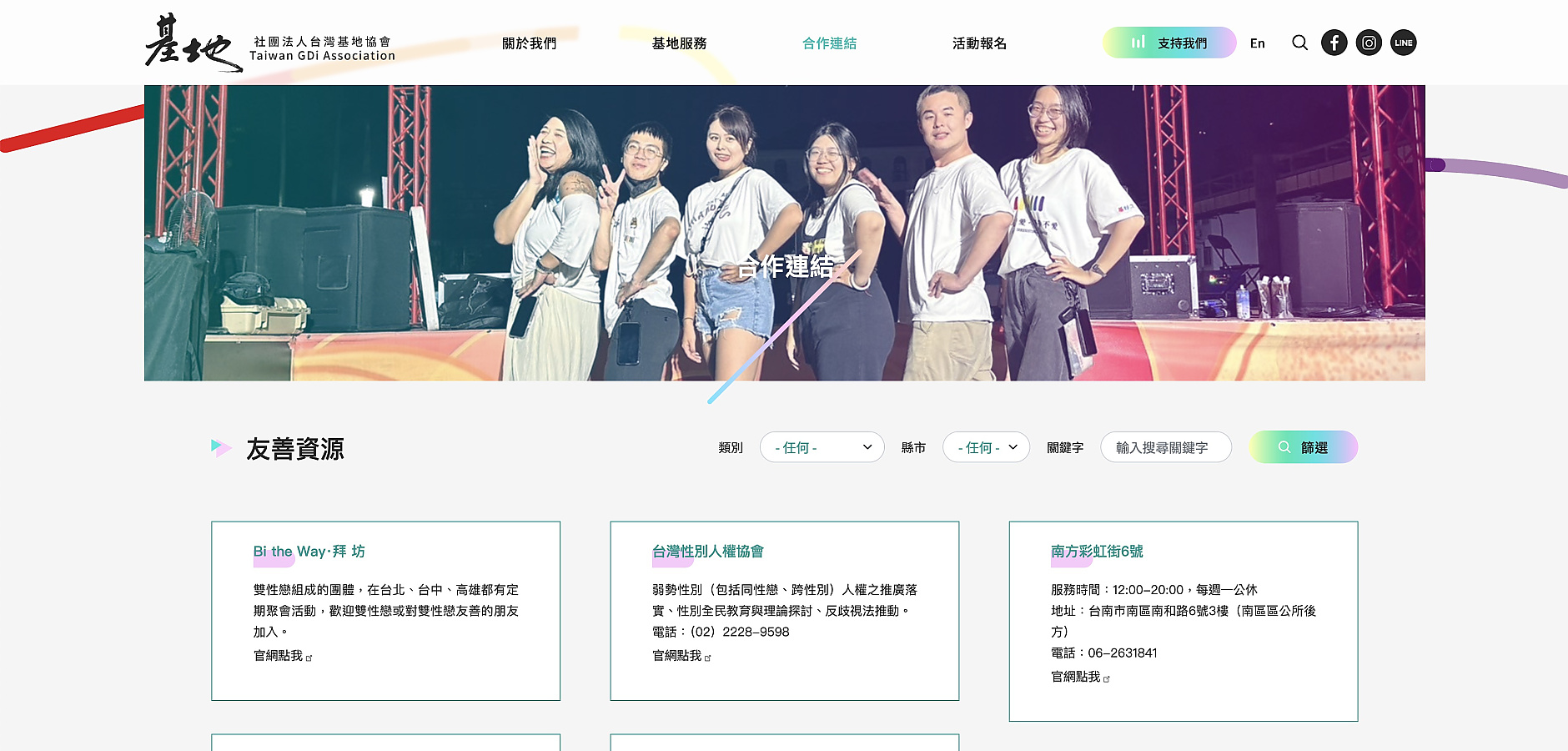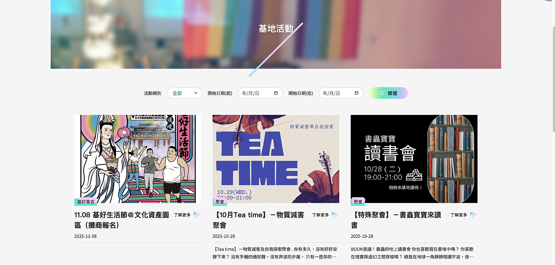 新增的 「篩選功能」,可以快速選擇分類、關鍵字、時間地點等條件,不論是想找近期活動,還是想尋找友善資源,都能透過簡單篩選找到想看的資訊,節省不少時間。對於第一次接觸基地的人來說,這樣的設計更直觀也更友善。